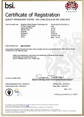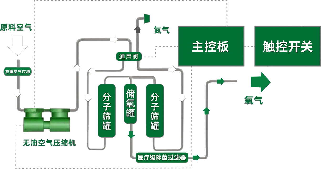以空氣為原料,先進的變壓吸附(Pressure Swing Adsorption)原理,物理制氧,安全性高。